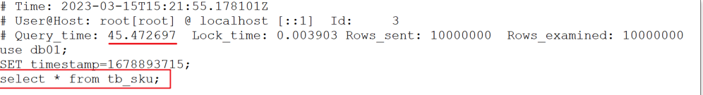 配置完毕之后,通过以下指令重新启动MySQL服务器进行测试,查看慢日志文件中记录的信息