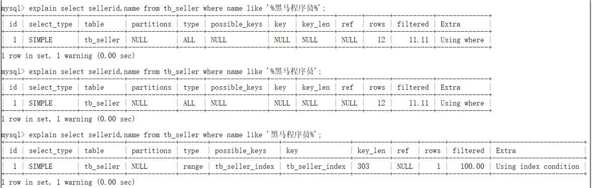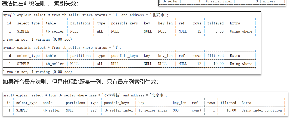 违反最左前缀法则:如果索引了多列,要遵守最左前缀法则。指的是查询从索引的最左前列开始,并且不跳过索引中的列。匹配最左前缀法则,走索引。如果符合最左法则,但是出现跳跃某一列,只有最左列索引生效