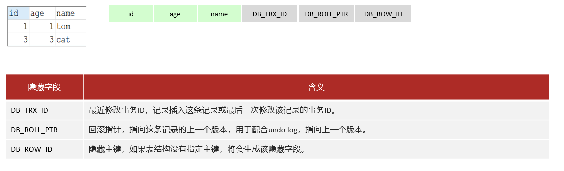 - roll_pointer(回滚指针),指向上一个版本的事务版本记录地址