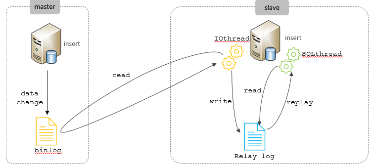 - slave重做中继日志中的事件,将改变反映它自己的数据。