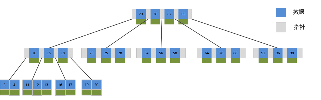 - 所有键值分布在整颗树中(索引值和具体data都在每个节点里);