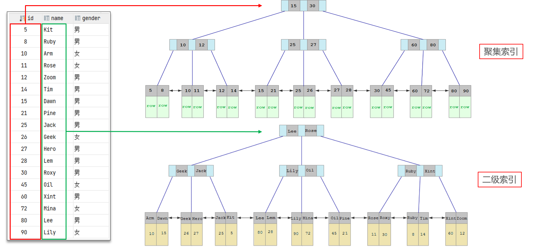 非聚簇索引(二级索引):数据与索引分开存储,B+树的叶子节点保存对应的主键,可以有多个
