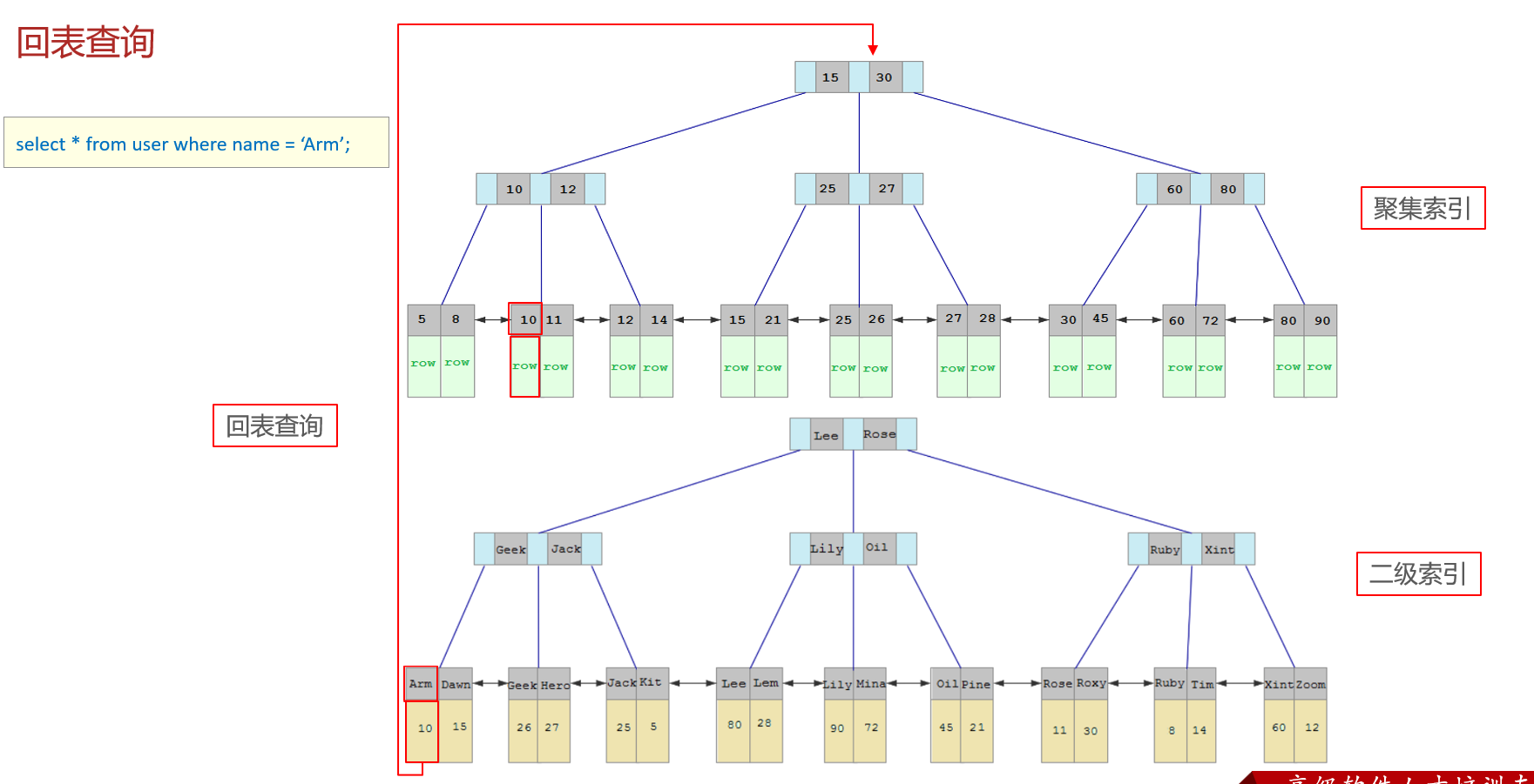 回表查询:通过二级索引找到对应的主键值,到聚集索引中查找整行数据,这个过程就是回表