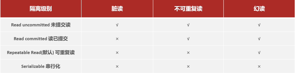 - 隔离级别:读未提交、读已提交、可重复读、串行化