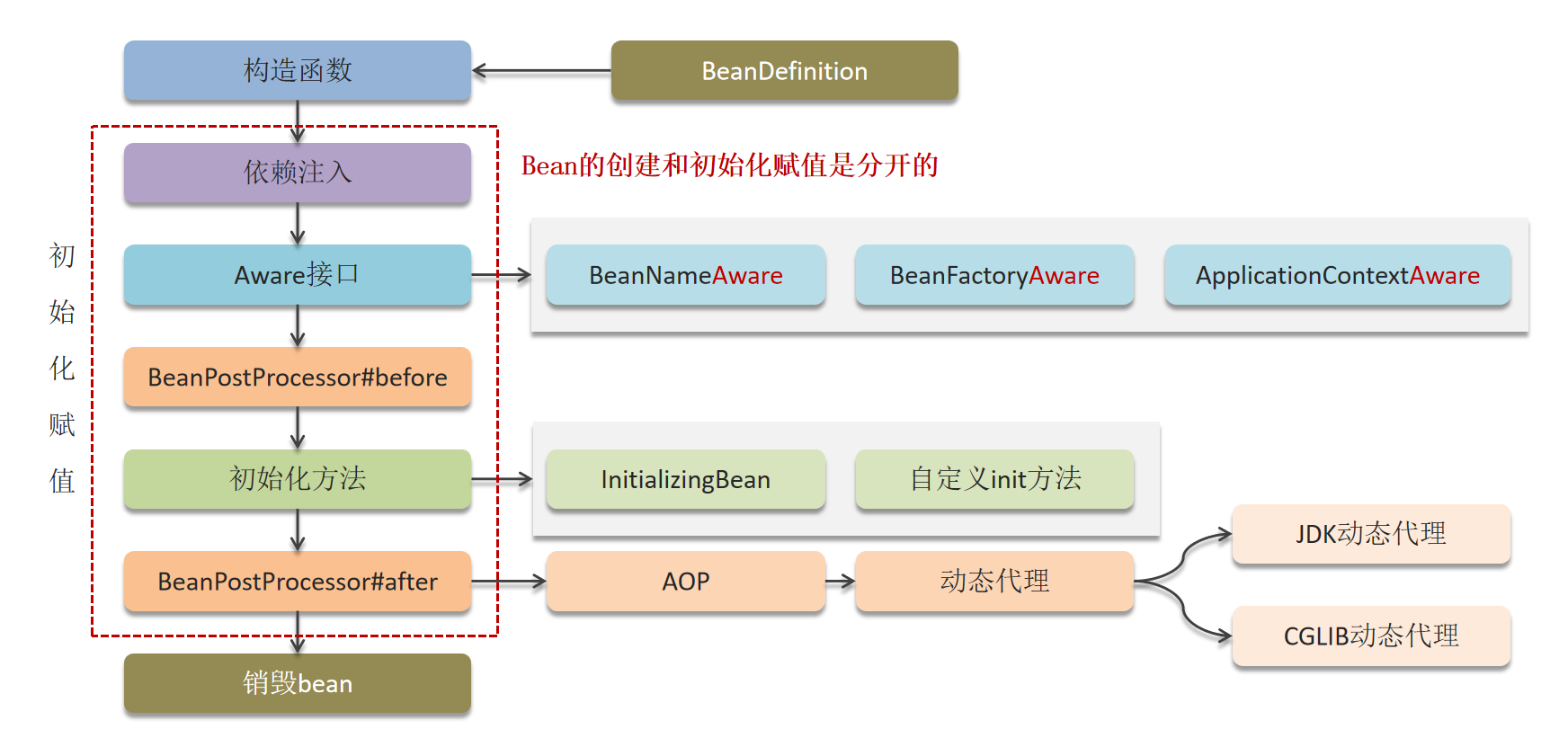 - 处理Aware接口:如果Bean实现了Aware接口(如BeanNameAware、BeanFactoryAware、ApplicationContextAware),Spring会调用相应的方法,让Bean获取到相关的资源