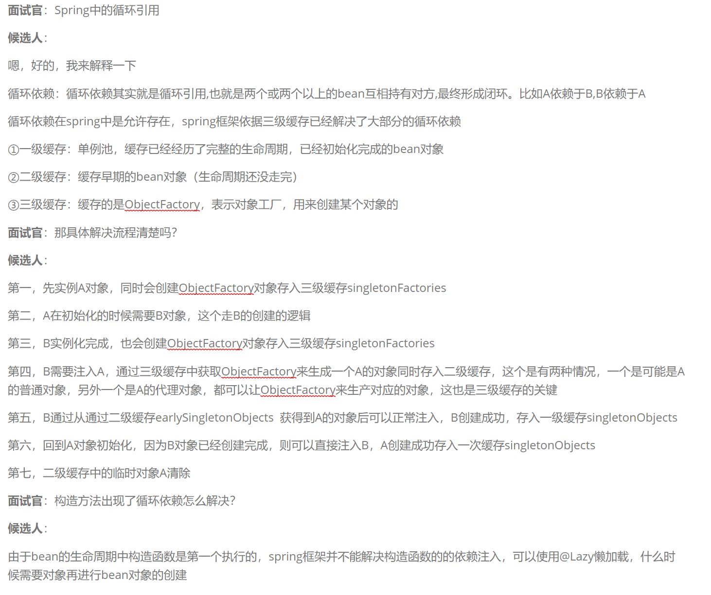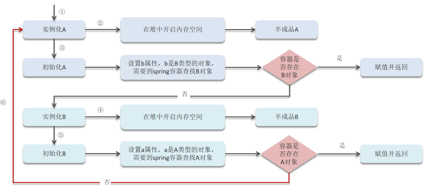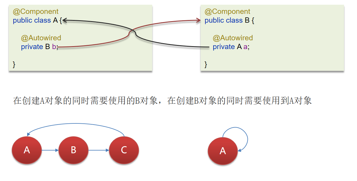 - 循环依赖:循环依赖其实就是循环引用,也就是两个或两个以上的bean互相持有对方,最终形成闭环。比如A依赖于B,B依赖于A