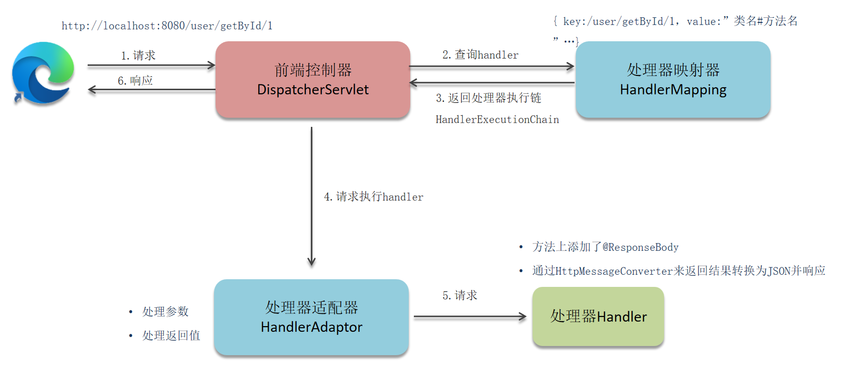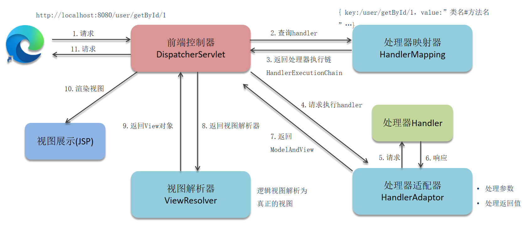 - 用户发送出请求到前端控制器DispatcherServlet
