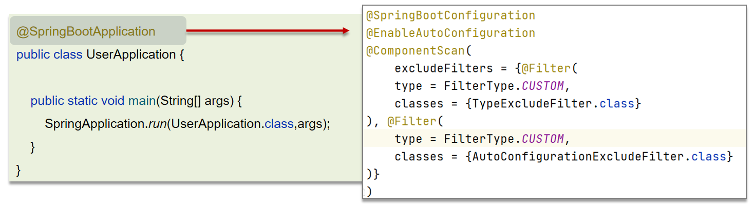 - 在Spring Boot项目中的引导类上有一个注解@SpringBootApplication,这个注解是对三个注解进行了封装,分别是: