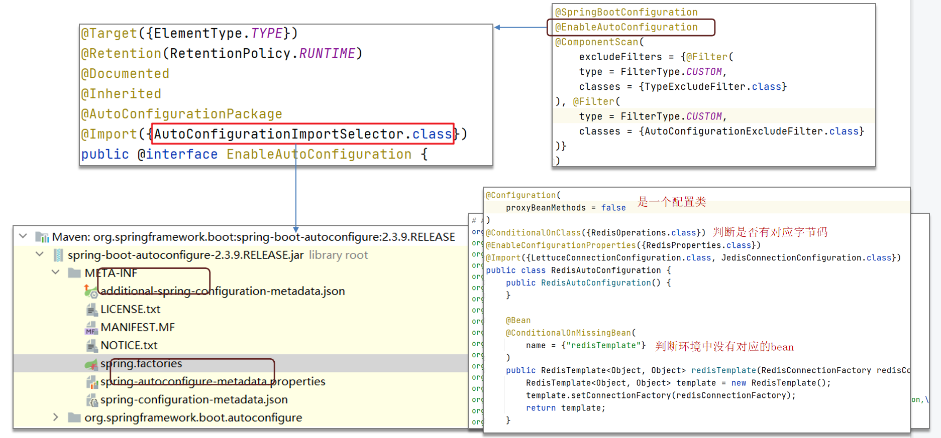 - @EnableAutoConfiguration:SpringBoot实现自动化配置的核心注解。
