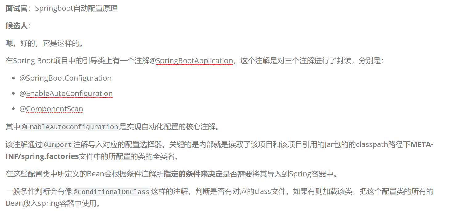 内部就是读取了该项目和该项目引用的Jar包的的classpath路径下META-INF/spring.factories文件中的所配置的类的全类名。 在这些配置类中所定义的Bean会根据条件注解所指定的条件来决定是否需要将其导入到Spring容器中。 - 条件判断会有像@ConditionalOnClass这样的注解,判断是否有对应的class文件,如果有则加载该类,把这个配置类的所有的Bean放入spring容器中使用。