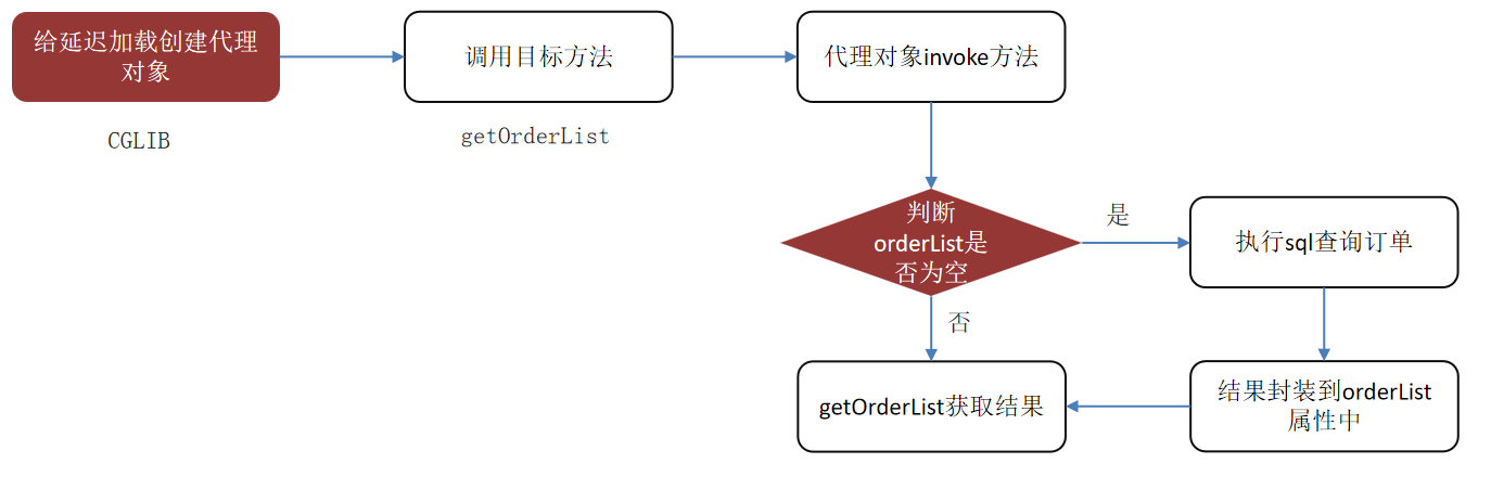 - 当调用目标方法user.getOrderList()时,进入拦截器invoke方法,发现user.getOrderList()是null值,执行sql查询order列表