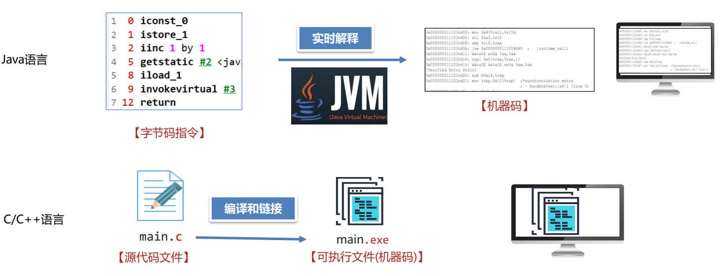 - 对字节码文件中的指令,实时的解释成机器码,让计算机执行