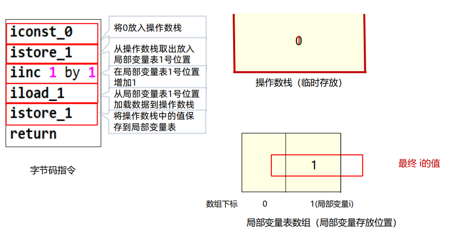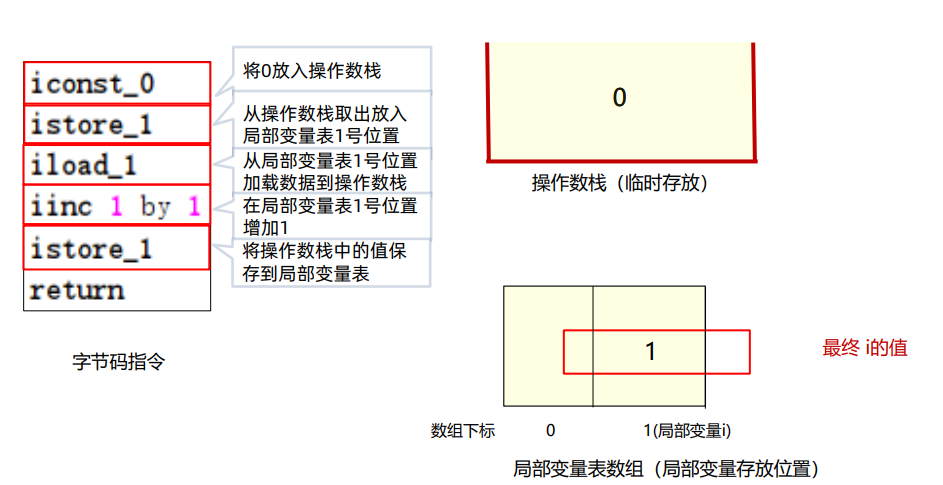 最终i的值是0,通过分析字节码文件发现,i++ 是先把0取出来放入操作数栈中,接下来在局部变量表中对i进行加1,i变成了1,最近再将之前操作数栈中的0取出来放入i,最后i就变成了0