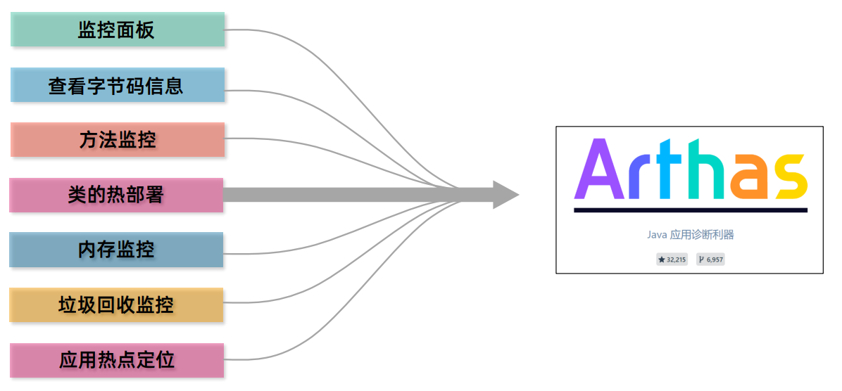 - Arthas 是一款线上监控诊断产品,通过全局视角实时查看应用 load、内存、gc、线程的状态信息,并能在不修 改应用代码的情况下,对业务问题进行诊断,大大提升线上问题排查效率