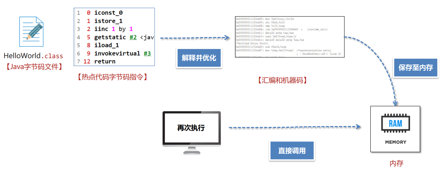 - 对字节码文件中的指令,实时的解释成机器码,让计算机执行