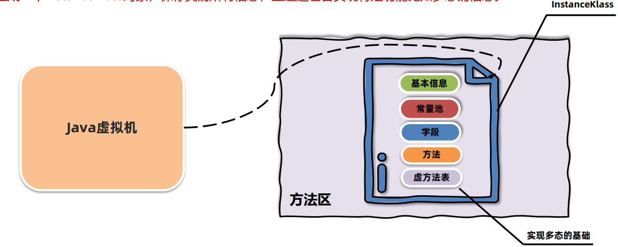 类加载器在加载完类之后,Java虚拟机会将字节码中的信息保存到内存的方法区中。 生成一个InstanceKlass对象,保存类的所有信息,里边还包含实现特定功能比如多态的信息