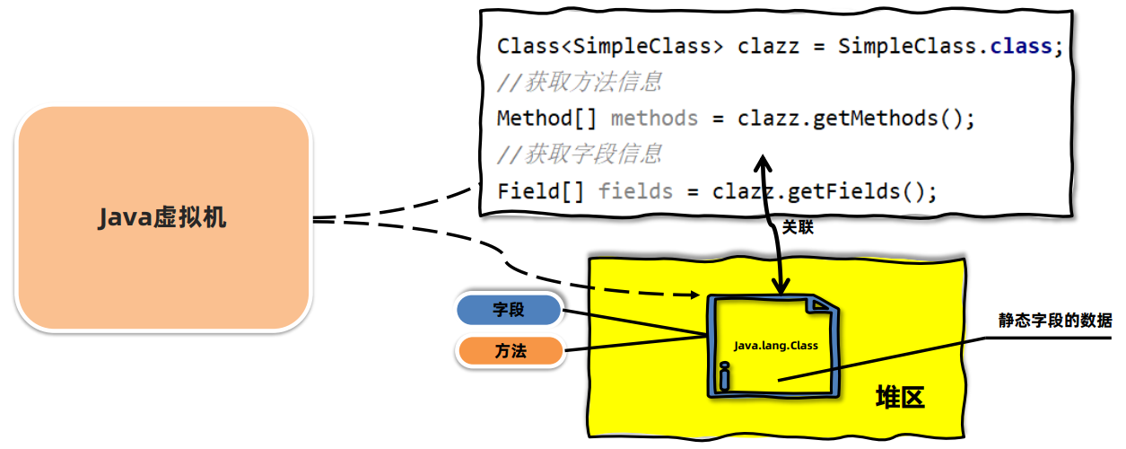 同时,Java虚拟机还会在堆中生成一份与方法区中数据类似的java.lang.Class对象。 作用是在Java代码中去获取类的信息以及存储静态字段的数据(JDK8及之后)