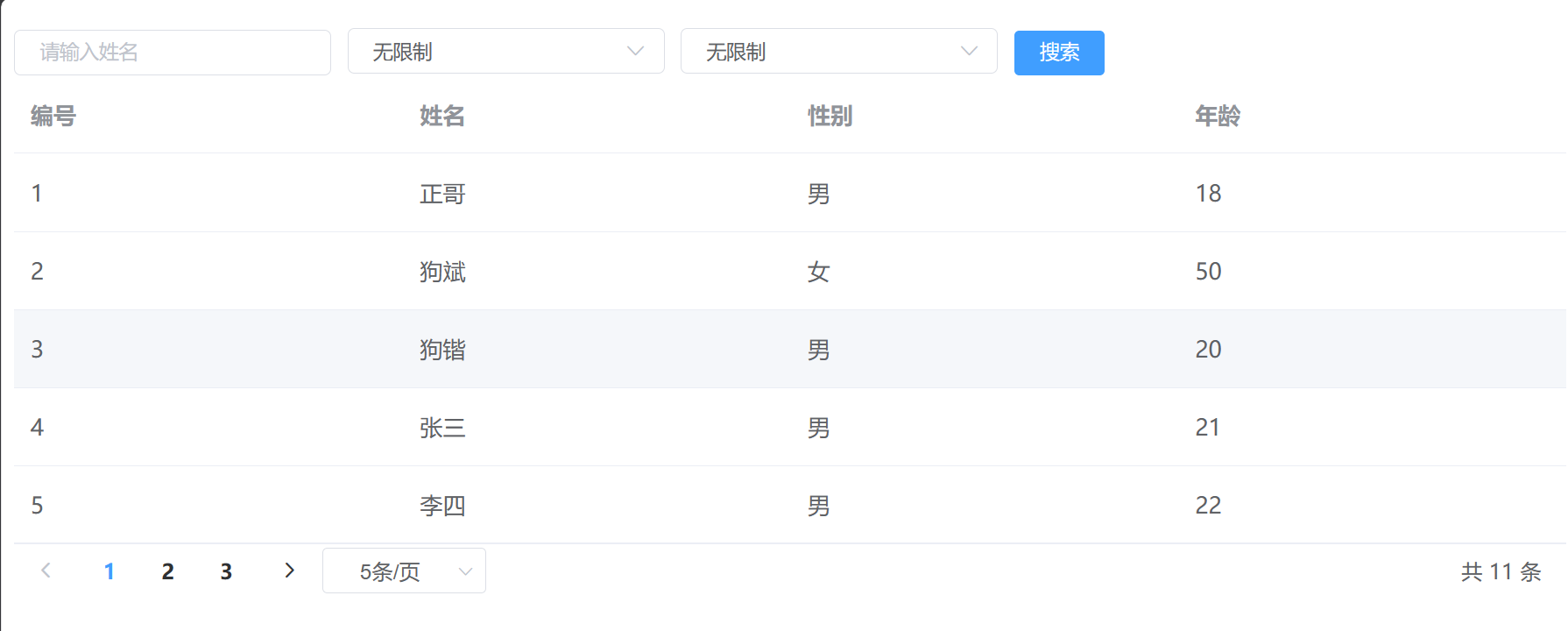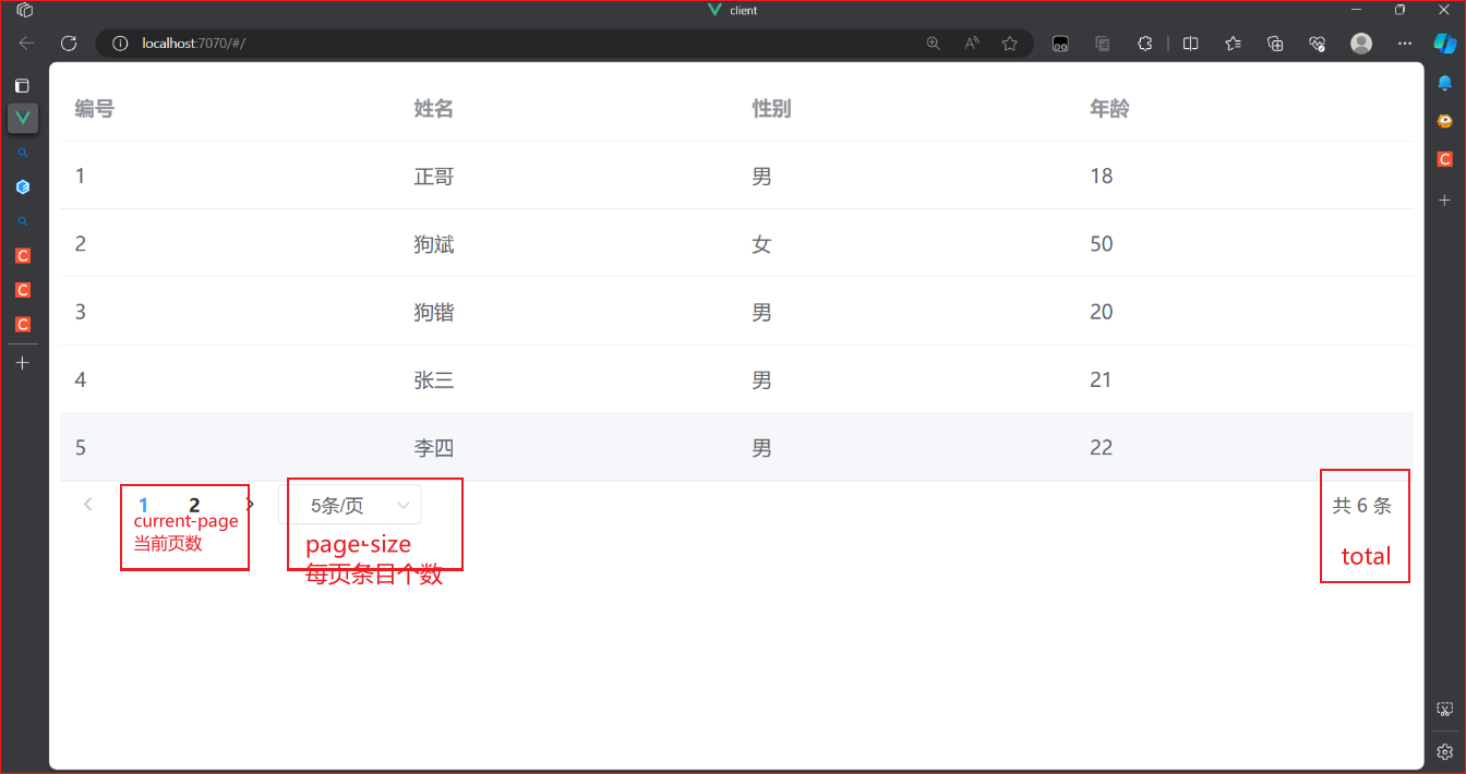 - :page-sizes=”[5,10,15,20]” :自定义每页条目数