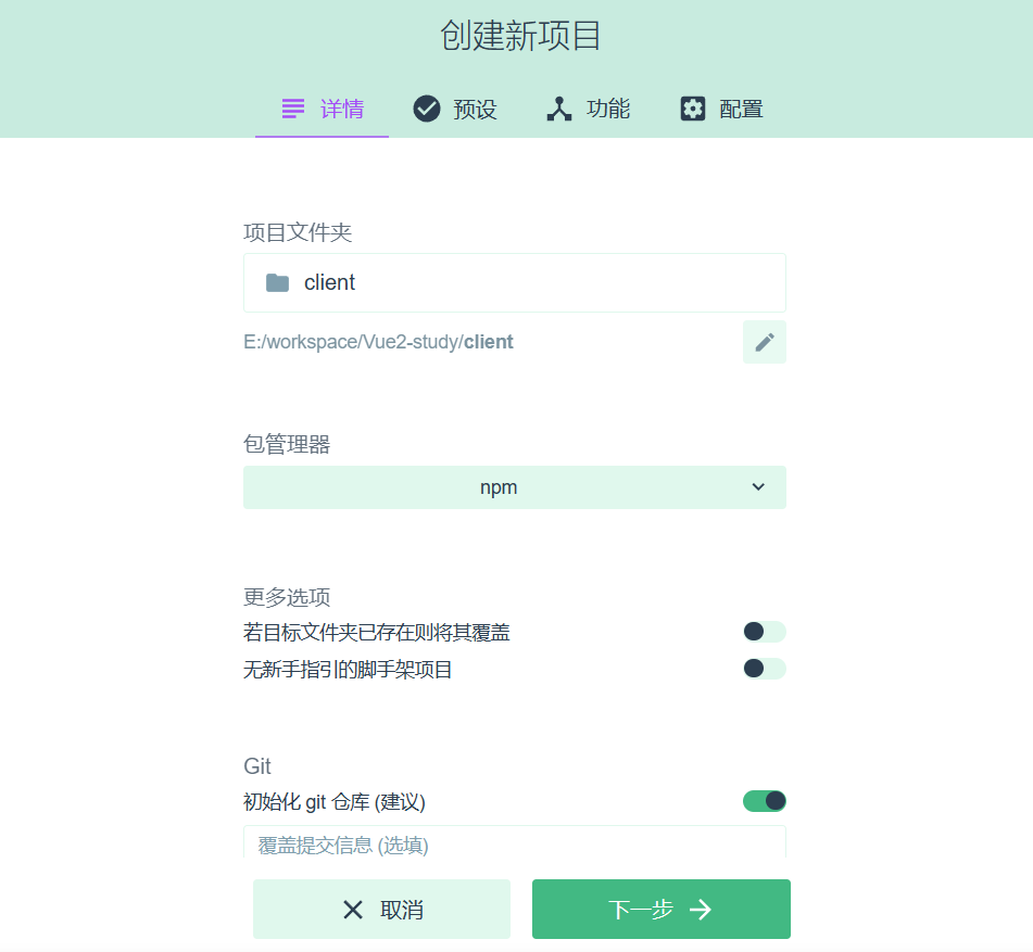 - g 参数表示全局安装,这样在任意目录都可以使用 vue 脚本创建项目