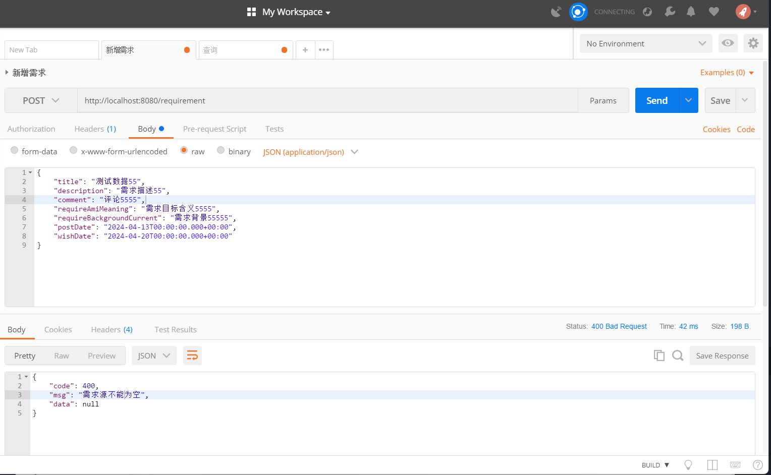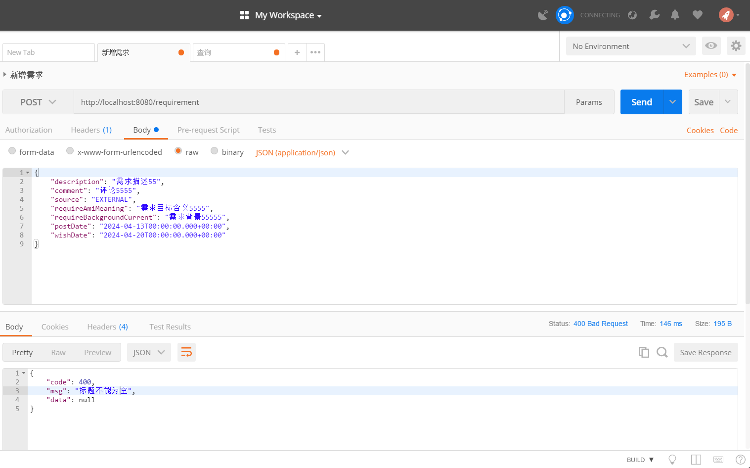 验证: 1、 接口必填参数未赋值时,请求返回错误状态码400,成功则返回状态码200。 2、 新增的数据可通过查询接口进行筛选。 3、 通过浏览器http请求或postman等工具进行验证。