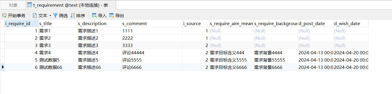 | 使用以上SQL语句,基于MySQL或其他数据库创建一个【需求管理表】。并基于该表实现基本的 新增 和 查询 业务接口,具体要求如下: 1、数据库连接方式不限,可通过JDBC或其他业务框架实现。 2、新增:做好接口请求参数的基本校验,包括:需求标题、需求来源为必填项,需求标题、需求描述分别不能超过20、50个字符。 3、查询:支持通过需求标题进行模糊查询。
